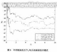 利用一臺(tái)僅以20Hz運(yùn)行的卡爾曼濾波器,在同等計(jì)算量的情況下比RLS具有更強(qiáng)的能力。圖6不同輪胎壓力下,卡爾曼濾波器的振動(dòng)估計(jì)模式,比原來少5倍的計(jì)算量,這種新的方法檢測到15%的壓力變化的速度與RLS算法檢測30%的一樣。