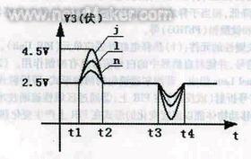 熱釋電傳感器的輸出信號(hào)直流電平為1V,幅度為1mV的交變信號(hào),該信號(hào)通過熱釋電傳感器內(nèi)部場(chǎng)效應(yīng)管的源極輸出,即圖1中的節(jié)點(diǎn)1。第一級(jí)運(yùn)算放大器(U1)是低頻小信號(hào)放大電路,輸出節(jié)點(diǎn)為3。第二級(jí)運(yùn)算放大器(U2)為具有微分補(bǔ)償電路的直流放大電路,由元件C1、R6、R7、R8和U2組成,輸出電壓V3波形如圖2。