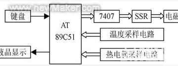 該控制器是以89C51為控制核心,以電磁閥為驅(qū)動部件,以及溫度采樣、熱電偶信號采樣、顯示等電路組成。系統(tǒng)框圖如圖2所示。
