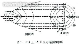 FADS一般安裝在飛行器前端,為了不影響雷達和火控裝置的安裝,也有將FADS安裝在機翼前端。F-14的FADS由23個壓力傳感器組成,安裝在機身前端。X-33的FADS系統(tǒng)則由6個壓力傳感器組成,安裝在機身前端。壓力傳感器的數(shù)目并沒有固定的規(guī)定。在F-14飛機上,其FADS的壓力傳感器布局如圖1所示。