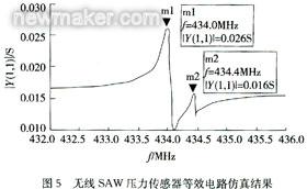 在圖5中可以看出,兩SAW諧振器有兩個中心諧振頻率,分別為434 MHz和434.4 MHz。這兩個頻率都在ISM標準無線頻率測量范圍之中,可有效進行無線測量。(end)