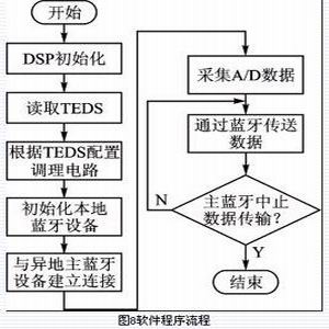 基于硬件結(jié)構(gòu)的設(shè)計搭建起來的測試系統(tǒng),需要通過DSP的軟件算法和上位機的軟件設(shè)計來實現(xiàn)。DSP的軟件算法需要實現(xiàn)以下幾個功能:讀取標(biāo)準(zhǔn)化傳感器電子數(shù)據(jù)表(TEDS),控制并調(diào)整各個數(shù)字電位器,傳感器信號的采集和計算,對藍(lán)牙模塊的接口控制設(shè)計。上位機軟件的設(shè)計是為了達到對主藍(lán)牙單元的控制以及顯示最終測量結(jié)果,軟件流程如圖8所示。