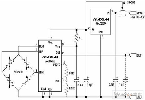1、由于HPX氣壓傳感器的輸出的是60±20mV的模擬信號,所以必須對其進(jìn)行調(diào)理,然后進(jìn)行A/D轉(zhuǎn)換,變成數(shù)字信號送處理器處理。因?yàn)樾盘柋容^小,在A/D之前必須把信號放大,這里選用一款價(jià)格低的高精度放大集成電路塊MAX1452,它是高度集成的高精度信號放大調(diào)理器,它具有抗干擾能力強(qiáng)、工作溫度范圍大、對信號放大進(jìn)行優(yōu)化等特性。下面是它用于調(diào)理和放大非線性信號的典型電路(圖2)。