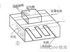 導(dǎo)電性傳感器的基本特點是,其置于揮發(fā)性化合物(VOC)時的響應(yīng)形式是電阻值發(fā)生變化。導(dǎo)電性傳感器又分為金屬氧化物傳感器和聚合物傳感器兩大類。金屬氧化物傳感器在電子鼻系統(tǒng)中應(yīng)用更廣泛,其結(jié)構(gòu)如圖1所示。此類傳感器中與VOC相接觸的活性材料是錫、鋅、鈦、鎢或銥的氧化物,襯底材料一般是硅、玻璃、塑料,發(fā)生接觸反應(yīng)需滿足200~400℃的溫度條件,因此在底部設(shè)置了加熱器。氧化物材料中用鉑、鈀等貴重金屬攙雜形成兩條金屬接觸電極。與VOC的相互作用改變了活性材料的導(dǎo)電性,使兩電極之間的電阻發(fā)生變化,這種電阻變化可用單臂電橋或其它電路來測量。事實上,一個傳感器的活性材料總是設(shè)計得對某些特定氣味響應(yīng)最靈敏。