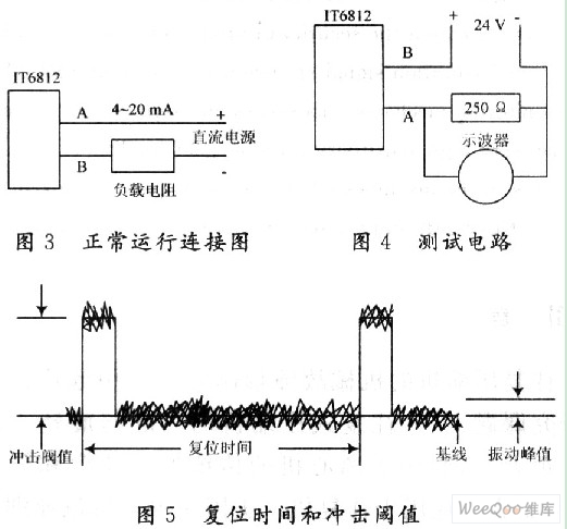 (3)4~20 mA電流的測(cè)量,此時(shí)沖擊傳感器進(jìn)入正常工作模式。6850沖擊儀可以讀出由沖擊傳感器產(chǎn)生的電流值。電流值與沖擊次數(shù)的關(guān)系是:在3.2 s的時(shí)間內(nèi),如果沒(méi)有發(fā)生超過(guò)閾值的沖擊事件,傳感器輸出4 mA,每增加1次超過(guò)閾值的沖擊事件,輸出增加1 mA,一直到發(fā)生16次以上超過(guò)閾值的沖擊事件,傳感器輸出20 mA。電流輸出的改變發(fā)生在每次復(fù)位時(shí)間周期的結(jié)束時(shí)刻,但是如果發(fā)生16次以上超過(guò)閾值的沖擊事件,則電流立即上升至20 mA,而不是等到時(shí)間周期結(jié)束,這是出于往復(fù)機(jī)運(yùn)行安全的考慮。