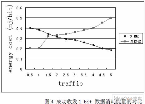 圖4 中,在業(yè)務(wù)量較小時,由于減少了偵聽時間的占空比,減少了空閑狀態(tài)下的能量消 耗。在網(wǎng)絡(luò)負(fù)載較重時,由于新協(xié)議增加了偵聽時間的占空比,導(dǎo)致能量消耗要遠(yuǎn)大于S— MAC,但提供了更好網(wǎng)絡(luò)的傳輸性能。而且綜合來看,新協(xié)議能耗更小。