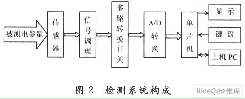 檢測系統(tǒng)構(gòu)成如圖2,被測量經(jīng)霍爾傳感器轉(zhuǎn)換為電壓信號,經(jīng)信號調(diào)理電路和多路轉(zhuǎn)換開關(guān)選擇,通過A/D轉(zhuǎn)換器送給單片機,單片機采用89C51,是該系統(tǒng)的主控器,鍵盤選用2×4鍵盤,用于選擇被測量的種類,采用數(shù)碼管或液晶顯示被測量的大小。