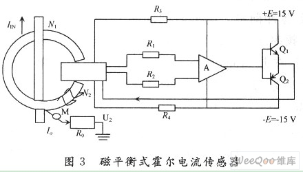 電流的測量可采用磁平衡式霍爾電流傳感器(亦稱為零磁通式霍爾傳感器)如圖3所示。
