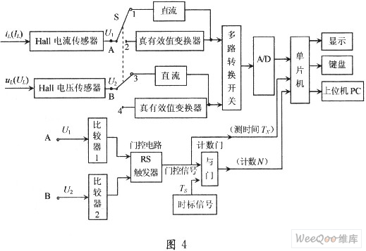 由正弦交流電有功功率的定義P=UIcosψ可知,只要準(zhǔn)確測量出U,I及電流與電壓相位差ψ,就可算出P與cosψ。采用傳統(tǒng)的電磁式電壓、電流互感器進行測量,由于互感器的非理想性,除存在變比誤差外,更主要的是存在較大的相位誤差,這就使測得的ψ值不能真實地反映負(fù)載的性質(zhì)。若采用霍爾電壓、電流傳感器及真有效值轉(zhuǎn)換器(如AD637)等,可以使功率及功率因數(shù)的測量精度大大提高。此外,霍爾傳感器還可以測量從直流到100 kHz的任意波形的交流量,從而克服了電磁式互感器有特定的額定頻率的弊端。真有效值轉(zhuǎn)換器可以將正弦波形或任意波形的交流量轉(zhuǎn)換為直流量,輸出直流的大小正比于交流量的有效值,且轉(zhuǎn)換精度高,因而測量相對準(zhǔn)確。