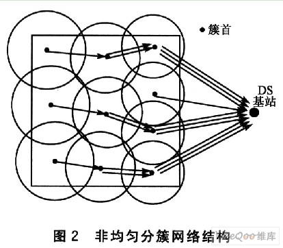 在網(wǎng)絡(luò)部署階段,基站用一個給定的發(fā)送功率向網(wǎng)絡(luò)內(nèi)廣播一個信號。每個傳感器節(jié)點在接收到此信號后,根據(jù)接收信號的強度計算它到基站的近似距離。獲得這個距離,不僅有助于傳感器節(jié)點向基站傳輸數(shù)據(jù)時選擇合適的發(fā)送功率以降低能量消耗,而且它還是算法構(gòu)造大小非均勻的簇的必需信息之一。非均勻分簇網(wǎng)絡(luò)結(jié)構(gòu)如圖2所示。