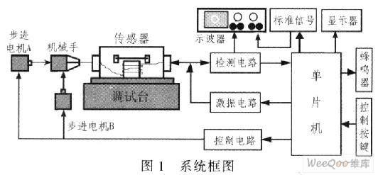 振弦式傳感器的調(diào)試過程:將一臺測頻儀接在傳感器上,為傳感器提供激勵信號并檢測其輸出頻率,同時,可將一臺李沙育圖形顯示器也接在傳感器上用以觀察輸出波形;接通儀器電源,傳感器開始工作,調(diào)試人員根據(jù)測頻儀測得的頻率用鉗子拉著鋼弦調(diào)整其松緊度以改變傳感器輸出頻率;根據(jù)波形的持續(xù)時間判斷是否有“碰弦”現(xiàn)象,通過拉緊鋼弦或改變鋼弦的高度排除“碰弦”;根據(jù)波形的圓滑和干凈程度判斷鋼弦是否有“擰麻花”現(xiàn)象,然后重新繃弦或用鉗子將鋼弦擰順?梢,這種人工調(diào)試法基本上沒有可操作的量化指標(biāo),調(diào)試質(zhì)量全由調(diào)試人員的經(jīng)驗(yàn)和熟練程度決定,難以保證產(chǎn)品質(zhì)量和參數(shù)的一致性。為減少調(diào)試過程中的主觀因素,提高產(chǎn)品的質(zhì)量和參數(shù)的一致性,設(shè)計(jì)一個智能調(diào)試系統(tǒng),系統(tǒng)框圖如圖1所示。