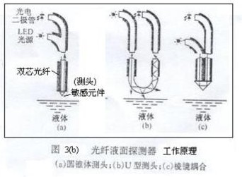 光纖液位傳感器的工作原理如圖3(b)所示。發(fā)光器件射出來的光通過傳輸光纖送到敏感元件,在敏感元件的球面上,有一部分透過,而其余的光被反射回來。當敏感元件與液體相接觸時,與空氣接觸相比,球面部的光透射量增大,而反射量減少。因此,由反射光量即可知道敏感元件是否接觸液體。反射光量決定于敏感元件玻璃的折射率和被測定物質(zhì)的折射率。被測物質(zhì)的折射率越大,反射光量越小。來自敏感元件的反射光,通過傳輸光纖由受光器件的光電晶體管進行光電轉(zhuǎn)換后輸出。敏感元件的反射光量的變化,若以空氣的光量為基準,在水中則為-6--7dB,在油中為-25-30dB?蓪Ψ瓷涔饬坎顒e很大的水和油等進行物質(zhì)判別。