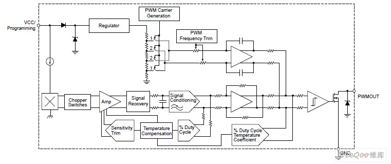 A1356 裝置是一款帶脈寬調(diào)制(PWM)輸出的高精度可編程開路漏極霍爾效應(yīng)線性傳感器IC。PWM 輸出信號(hào)的占空比 (D) 與施加的磁場(chǎng)成比例。A1356 裝置能通過(guò)其內(nèi)置霍爾元件將模擬信號(hào)轉(zhuǎn)換為數(shù)字編碼 PWM 輸出信號(hào)。數(shù)字編碼 PWM 輸出的耦合抗擾性遠(yuǎn)遠(yuǎn)超出了模擬輸出信號(hào)的抗擾性。