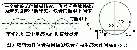 車輪輪徑一般為35cm-47cm。以最大輪徑47cm考慮,其半徑為23.5cm,選取敏感元件設(shè)置的高度在距車輪下緣1.5cm處。為避免中斷沖突,可選取兩個(gè)敏感元件的間距N大于2L。由圖3可知,