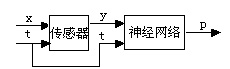 受溫度影響的傳感器系統(tǒng)可以表示為:y=f(x,t)。其中,y表示傳感器的輸出量,x表示傳感器的輸入量,t表示環(huán)境溫度。由于傳感器產(chǎn)生的非線性誤差和溫度誤差,使f(x,t)呈現(xiàn)非線性。神經(jīng)網(wǎng)絡(luò)對于消除和補(bǔ)償傳感器系統(tǒng)的非線性特性提供了一種新途徑,如圖2所示: