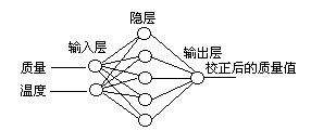 在本系統(tǒng)以輸入層、中間層和輸出層的神經(jīng)元個數(shù)分別為:2、5、1為例。其中輸入變量分別為目標(biāo)參量——待校正的質(zhì)量值和非目標(biāo)參量——溫度,輸出變量為校正后的質(zhì)量值,網(wǎng)絡(luò)結(jié)構(gòu)圖如圖3所示。