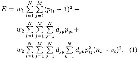 在階段二,使用模糊Hopfield神經(jīng)網(wǎng)絡(luò)對WSN網(wǎng)絡(luò)節(jié)點進行模糊聚類[4、5] ,分類數(shù)為階段一中求得的M,輸入樣本為待調(diào)度節(jié)點.同一類中的所有節(jié)點可以在同一個時隙同時被調(diào)度;不同類中的節(jié)點必須在不同時隙被調(diào)度.考慮N×M結(jié)構(gòu) Hopfield網(wǎng)絡(luò),節(jié)點i是否在第j個時隙傳輸數(shù)據(jù)由Hopfield處在(i,j)位置神經(jīng)元的輸出Pij確定.利用第2節(jié)中的約束條件來設(shè)計優(yōu)化目標,即Hopfield網(wǎng)絡(luò)能量函數(shù)E.首先,所有的數(shù)據(jù)包應(yīng)該在一個時隙內(nèi)同步傳送;其次,當節(jié)點i時隙j傳輸數(shù)據(jù)時,其他所有節(jié)點i的相鄰節(jié)點不能分配在時隙j;最后,當節(jié)點i傳輸數(shù)據(jù)時,i的二跳相鄰節(jié)點也不能被分配到時隙j去傳輸數(shù)據(jù).能量函數(shù)E大小反映網(wǎng)絡(luò)當前時隙調(diào)度與最優(yōu)調(diào)度間差距,在考慮所有以上約束條件后,本文所設(shè)計能量函數(shù)E如下: