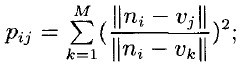 其中:ni表示第i個節(jié)點,dij為節(jié)點i,j間歐氏距離,權(quán)值w1和w2為正且滿足w1+w2=l,權(quán)系數(shù)取值會影響網(wǎng)絡(luò)收斂性,需合理選取.Vi為第i類歐氏中心,即