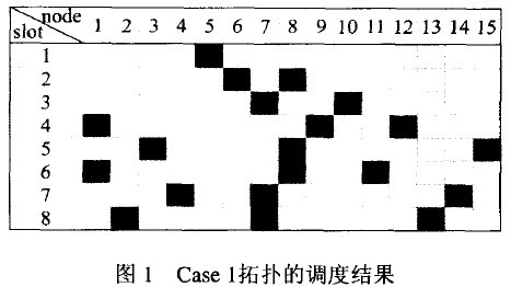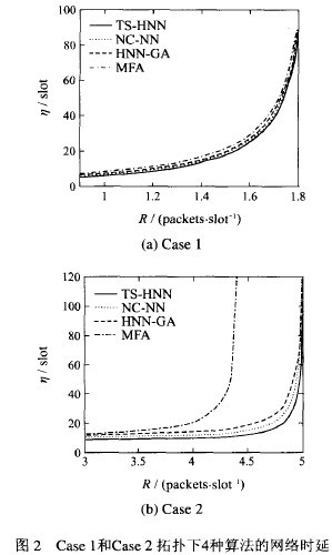 對TS-HNN算法的調(diào)度性能進行分析,與平均退火策略(MFA) [2] 、基于遺傳算法的Hopfield神經(jīng)網(wǎng)絡(luò)(HNN-GA) [4]和含噪混沌神經(jīng)網(wǎng)絡(luò)(NC-NN) [5]3種方法調(diào)度性能比較.使用3種不同拓撲的測試網(wǎng)絡(luò)Case 1~3[6] . 實驗中使用的數(shù)據(jù)包為固定長度,時隙長度設(shè)置為每包所需傳輸時間;節(jié)點問以泊松分布隨機收發(fā)數(shù)據(jù)包.每種拓撲結(jié)構(gòu)運行50次,取平均值進行比較.表1給出本文算法(TS-HNN)與其他3種方法求解得到的網(wǎng)絡(luò)最小延遲η和幀長度M.在節(jié)點數(shù)較少(Case 1)或平均度數(shù)不高時(Case 3),4種算法都能找到最優(yōu)幀長M=8;對于節(jié)點數(shù)較多具有復(fù)雜結(jié)構(gòu)網(wǎng)絡(luò)(Case 2),TS-HNN也能找到次優(yōu)幀長;且TS-HNN在3種拓撲下都具有最低的網(wǎng)絡(luò)時延.測試拓撲Case 1調(diào)度結(jié)果如圖l所示,填充有黑色的方格代表所在節(jié)點(node)在該時隙(slot)可被調(diào)度.圖2詳細描述了網(wǎng)絡(luò)時延隨數(shù)據(jù)包(packets)服務(wù)速率變化的情況.隨著服務(wù)速率增加,網(wǎng)絡(luò)時延也在變長,在節(jié)點數(shù)較少時(Case 1),4種算法的時延相差不大,如圖 2(a);當節(jié)點數(shù)增加時(Case 2),4種算法下的網(wǎng)絡(luò)時延差異明顯增大,如圖2(b).