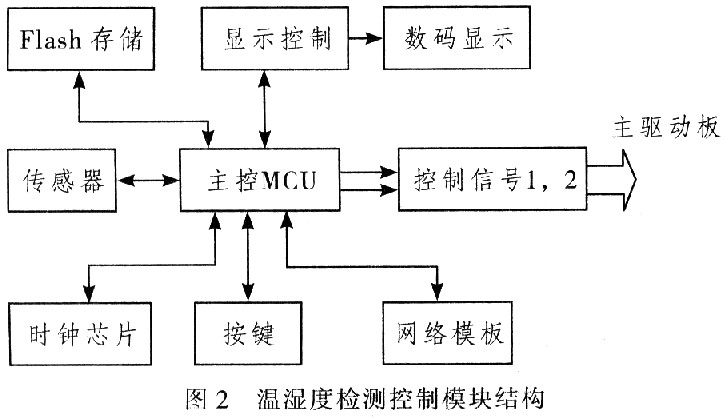 溫濕度測(cè)試模塊的結(jié)構(gòu)如圖2所示,其結(jié)構(gòu)包括:主控制器(MCu)、溫濕度傳感器、數(shù)顯及按鍵、Flash存儲(chǔ)器、網(wǎng)絡(luò)傳輸模塊、時(shí)鐘器件、蜂鳴器。其測(cè)試控制過程為:每隔一定時(shí)間MCU進(jìn)行一次溫濕度測(cè)量,如果與中心服務(wù)器連機(jī),將結(jié)果通過網(wǎng)絡(luò)上傳至中心服務(wù)器,否則將結(jié)果和當(dāng)前時(shí)間存儲(chǔ)在板上的Flash;再將濕度測(cè)量值與用戶設(shè)定值比較,根據(jù)比較的結(jié)果進(jìn)行不同的處理。例如,當(dāng)測(cè)試濕度高于設(shè)定值時(shí),通過控制除濕材料吸收濕氣來降低濕度,如果達(dá)到設(shè)定濕度值后,通過一定的反饋控制使柜內(nèi)的濕度保持于設(shè)定范圍內(nèi)。如果溫度或者濕度高于危險(xiǎn)門限,系統(tǒng)通過蜂鳴器報(bào)警。