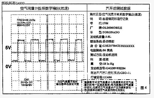 高頻數(shù)字式空氣流量計(jì)出現(xiàn)在通用汽車3.8L V6型發(fā)動(dòng)機(jī)上,它是日立(Hitachi)生產(chǎn)的傳感器。此外,高頻數(shù)字式空氣流量計(jì)還應(yīng)用于凌志(Lexue)以及其它汽車中。傳感器的脈沖大多數(shù)幅值為5V,怠速時(shí)頻率:2.77kHz。