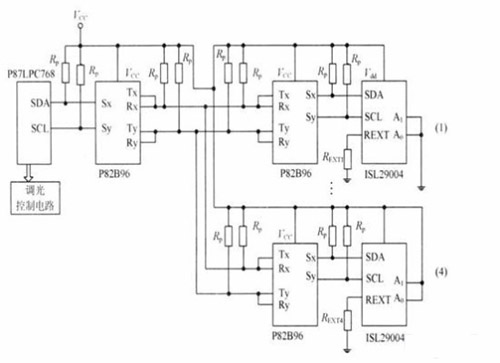 系統(tǒng)構(gòu)成框圖如圖1所示。單片機(jī)P87LPC768作為I2C總線的主控器,ISL29004作為被控器,4個(gè)ISL29004的設(shè)備地址依次為:44H~47H,通過(guò)ISL29004的地址引腳A1,A0進(jìn)行設(shè)置。在系統(tǒng)中,使用了準(zhǔn)雙向I2C總線緩沖器P82896對(duì)I2C總線進(jìn)行驅(qū)動(dòng)擴(kuò)展,實(shí)現(xiàn)I2C總線的遠(yuǎn)距離傳輸,拓展了照度采集距離;P87LPC768的I2C總線經(jīng)P82896緩沖器擴(kuò)展后通過(guò)雙絞線和遠(yuǎn)端的P82896以及ISL29004連接。與4組照度采集電路相對(duì)應(yīng),調(diào)光控制電路也有4組,與P87LPC768的4個(gè)PWM引腳相連。