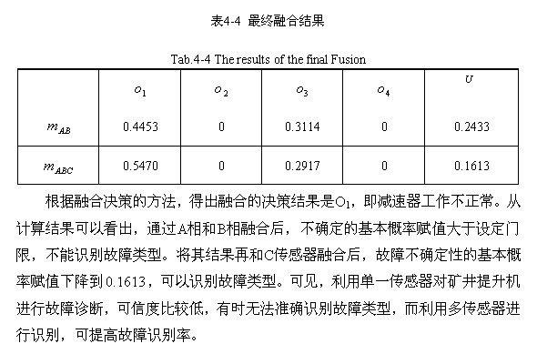 根據(jù)融合決策的方法,得出融合的決策結(jié)果是O1,即減速器工作不正常。從計算結(jié)果可以看出,通過A相和B相融合后,不確定的基本概率賦值大于設(shè)定門限,不能識別故障類型。將其結(jié)果再和C傳感器融合后,故障不確定性的基本概率賦值下降到 ,可以識別故障類型。可見,利用單一傳感器對礦井提升機進行故障診斷,可信度比較低,有時無法準確識別故障類型,而利用多傳感器進行識別,可提高故障識別率。