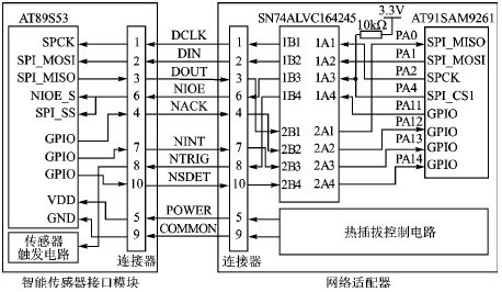 圖1給出了TII的接口電路圖。左邊是智能傳感器接口模塊(STIM),右邊是支持熱插拔功能的網(wǎng)絡適配器(NCAP)。其中,GPIO是微處理器的通用輸入輸出引腳,SN74ALVC164245為雙向5~3.3 V電平轉(zhuǎn)換芯片。在筆者實驗室設計的電力系統(tǒng)傳感器網(wǎng)絡中,上述兩個模塊分別采用了芯片AT89S53和AT91SAM9261。圖中還給出了兩者之間的數(shù)據(jù)傳輸和電源接線設計方案。