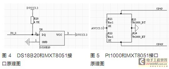 對于體溫信號的感知,采用的是Dallas Semiconductor公司的DS18B20傳感器。它擁有獨(dú)特的單總線接口,只需一個(gè)接口引腳即可通信;且它能直接將數(shù)字信號傳給單片機(jī),從而省去了很多模擬前端的外圍電路設(shè)計(jì);同時(shí)可通過配置內(nèi)部的寄存器使其分辨率達(dá)到0.0625℃。這些特性說明,在硬件上DS18B20已經(jīng)可以承擔(dān)體溫信號的采集任務(wù)。DS18B20傳感器與MXT8051的接口原理圖如圖4所示。