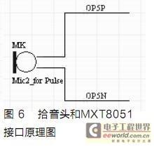 對于脈搏信號的感知,選取普通的拾音頭MIC即可感知脈搏音信號,將采集到的模擬信號通過片上運(yùn)算放大器交由MXT8051處理。拾音頭與MXT8051的接口原理圖如圖6所示。