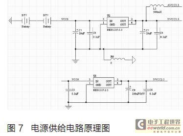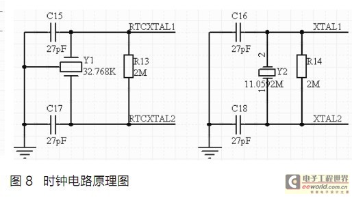 系統(tǒng)控制模塊中,所包含的電源供給電路、時(shí)鐘電路、復(fù)位電路、鍵盤控制電路等需要的器件都可參考由北京時(shí)代民芯科技有限公司提供的MXT8051開發(fā)板上的成熟產(chǎn)品,借鑒其接口方式并稍作修改,可滿足預(yù)期要求。其中稍作修改的電源供給原理圖及時(shí)鐘電路原理圖如圖7、圖8所示。