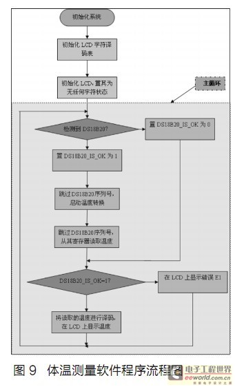 將本文提到的設(shè)計(jì)方案投入實(shí)踐中,最終完整實(shí)現(xiàn)的功能是體溫測量,在此給出體溫測量的軟件程序流程圖如圖9所示。