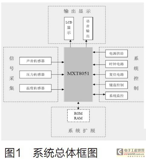 系統(tǒng)總體設(shè)計(jì)方案如圖1所示,整個(gè)系統(tǒng)由5大部分組成,MXT8051為核心處理模塊,并配備以傳感器為主的信號采集模塊,以語音芯片和LCD為主的輸出顯示模塊,電源及鍵盤等系統(tǒng)控制模塊以及應(yīng)用擴(kuò)展模塊等。