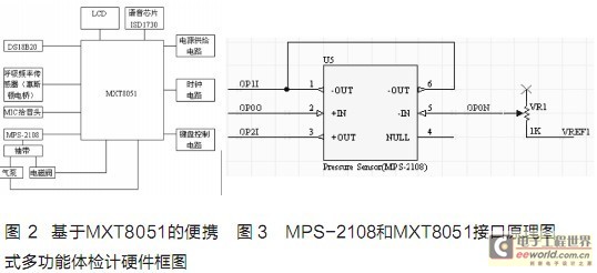 對于血壓信號的感知,可采用Metrodyne Microsystem公司的MPS-2108傳感器。它在血壓計(jì)、數(shù)字壓力計(jì)及醫(yī)療設(shè)備領(lǐng)域的廣泛應(yīng)用已表明其可以勝任本文所要設(shè)計(jì)的功能。MPS-2108傳感器和MXT8051的接口原理圖如圖3所示。