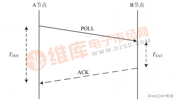 在T OF 測距時(shí),本地節(jié)點(diǎn)A 向遠(yuǎn)程節(jié)點(diǎn)B 發(fā)送一個(gè)數(shù)據(jù)包,當(dāng)B 節(jié)點(diǎn)收到數(shù)據(jù)包時(shí),會自動發(fā)送一個(gè)確認(rèn)來響應(yīng)這個(gè)數(shù)據(jù)包。執(zhí)行過程如圖1 所示。