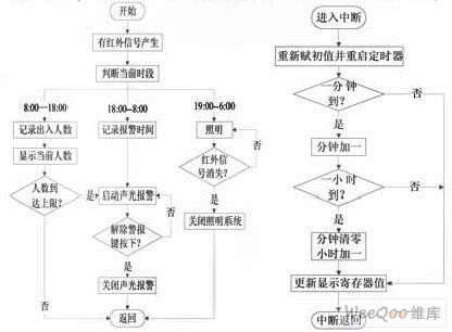 系統(tǒng)工作時(shí),若紅外傳感器檢測到有人靠近,會(huì)產(chǎn)生一個(gè)高電平的報(bào)警信號(hào)輸入到主控芯片,主程序通過查詢當(dāng)前時(shí)間跳轉(zhuǎn)到相應(yīng)的功能區(qū):若在第一時(shí)段,則單片機(jī)發(fā)出指令實(shí)現(xiàn)聲光報(bào)警并記錄當(dāng)前時(shí)間;若在第二時(shí)段,則對(duì)經(jīng)過人數(shù)進(jìn)行計(jì)數(shù);若在第三時(shí)段,則控制照明系統(tǒng)開啟并在人離開后關(guān)閉照明系統(tǒng)。紅外信號(hào)判斷子程序及定時(shí)中斷流程如圖5所示。