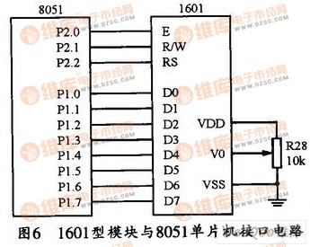 本儀器采用的1601字符型液晶顯示模塊具有體積小、功耗低、顯示內(nèi)容豐富等特點(diǎn)。該模塊的工作電壓為5 V,并帶有字符對(duì)比度調(diào)節(jié)和背光等功能。1601模塊與單片機(jī)的接口電路如圖6所示。