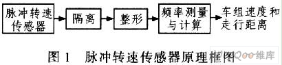 從上式可知,測量列車速度就是檢測列車車輪轉(zhuǎn)速和列車輪徑。脈沖轉(zhuǎn)速傳感器安裝在輪軸上,輪軸每轉(zhuǎn)動(dòng)一周,傳感器輸出一定數(shù)目的脈沖,使脈沖頻率與輪軸轉(zhuǎn)速成正比。輸出的脈沖經(jīng)隔離和整形后直接輸入計(jì)算機(jī)CPU進(jìn)行頻率測量,再經(jīng)換算從而得出車組速度和走行距離閉。其原理框圖如圖1所示。