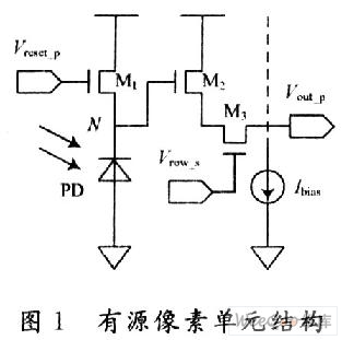 像素陣列是CMOS圖像傳感器中最重要的組成部分,現(xiàn)在大多數(shù)像素單元使用有源像素單元結(jié)構(gòu),如圖1所示。PD通常是N+/P-well形成的二極管,反向偏置PD,作為傳感器中的感光元件。在充電周期,重置脈沖Vreset_p是高電平,M1導(dǎo)通,電源對PD充電;在積分周期,Vreset_p降為低電平,M1截止,由于入射光的照射,PD產(chǎn)生反向光電流,對PD進行放電;節(jié)點N的電壓VN隨之下降,VN下降的斜率與入射光的光強成正比。當(dāng)積分周期結(jié)束時,行選信號Vrow_s產(chǎn)生一個脈沖導(dǎo)通M3,VN經(jīng)源極跟隨器輸出至后處理電路。