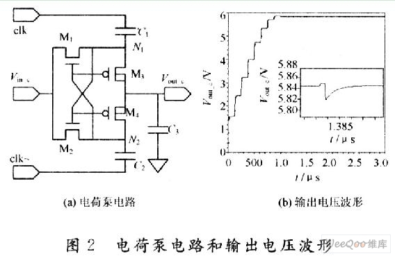 這個電路使用了兩個非重疊的、反相的時鐘clk和clk~,幅值為電源電壓Vdd兩個NMOS器件M1和M2以交叉耦合的方式連接,交替導(dǎo)通,導(dǎo)通時分別拉動相應(yīng)節(jié)點N1或N2至輸入電壓Vin_c。時鐘脈沖交替加在電容C1和C2上,在NMOS截止的一邊,相應(yīng)電容的電壓泵至Vdd+Vin_c,同時這一邊的PMOS導(dǎo)通,輸出這個電壓至Vout_c。在一些時鐘周期以后,節(jié)點N1和N2有反相的、幅值為Vdd+Vin_c的時鐘脈沖,兩個PMOS交替導(dǎo)通,使輸出Vout_c一直為Vdd+Vin-c本文中,Vin_c設(shè)為Vdd由于NMOS的閾值電壓的影響,Vout_c=2Vdd-Vthn。輸出波形如圖2(b)所示。電荷泵的輸出Vout_c在經(jīng)歷最初的大約1μs的時間以后達到穩(wěn)定,穩(wěn)定值約為5.8 V。圖中的小插圖是輸出電壓穩(wěn)定以后的紋波電壓.它的擺幅約為30 mV。由于這個電壓在充電周期加在像素單元中的重置開關(guān)的柵極上,導(dǎo)通重置開關(guān)使充電節(jié)點電壓達到電源電壓,因此當(dāng)充電節(jié)點電壓已經(jīng)達到電源電壓以后,柵極電壓上的紋波不再影響充電節(jié)點電壓,所以電荷泵輸出端的電容C3不必做得很大,以減小紋波電壓的擺幅。