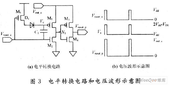 像素單元的重置脈沖信號Vreset_p由外圍電路產(chǎn)生,它的幅值是電源電壓Vdd,為使這個高電平升高為電荷泵的輸出電壓,需要一個電平轉(zhuǎn)換電路,如圖3(a)所示。Vreset_c是由外圍電路產(chǎn)生的普通的重置脈沖信號,它經(jīng)過兩個反相器將幅值提高至Vout_c,兩個反相器的電源電壓由Vout_c代替。M5,D1和C1的使用是為了正確地控制M1。當(dāng)Vreset_c是低電平時,M2截止,M5導(dǎo)通,電源電壓對C1充電至VC由于D1的正向電壓,VC=Vdd-Vdd,由于VCHP,因此M1導(dǎo)通,VN=VOUT_C;當(dāng)VRESET_C是高電平時,M2導(dǎo)通,由于電容C1的電荷保持特性,此時VC=2VDD-V1,這個電壓超過VOUT_C,M1截止,因此VN1降為低電壓。這個時候因為D1的單向性,電容C1的電荷不經(jīng)過M5回流,保持VC的不變。這樣節(jié)點N1上產(chǎn)生了與VRESET_C反相的波形,再經(jīng)過M3和M4組成的反相器的反相,輸出VRESET_P與VRESET_C同相。但幅值已被提高。圖3(B)是信號的波形示意圖。