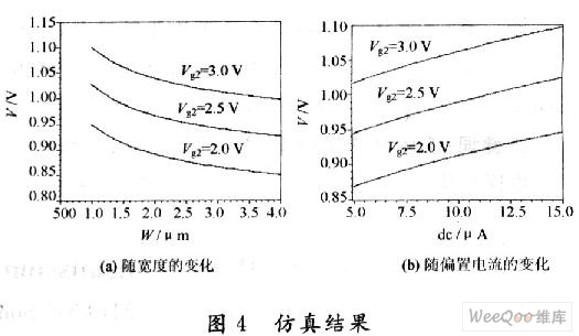 圖4中顯示的是對像素單元中的源極跟隨器的仿真結(jié)果.由等式(4)可知,源極跟隨器的柵源電壓Vgs2與寬度W的方根成反比,如圖4(a)所示,與偏置電流Ibins的方根成正比。同時調(diào)整源極跟隨器的寬度和偏置電流可以降低充電節(jié)點電壓的擺動范圍下界。在本電路中,寬度由1.5 μm調(diào)整至3 μm,偏置電流有10 μA調(diào)整至5 μA,Vgs2可減小大約80 mV,有效地拓展了充電節(jié)點電壓擺動范圍下界。