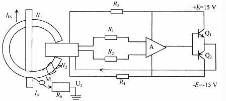當(dāng)被測電流IIN流過原邊回路時(shí),在導(dǎo)線周圍產(chǎn)生磁場HIN這個(gè)磁場被聚磁環(huán),并感應(yīng)給霍爾器件,使其有一個(gè)信號UH輸出;這一信號經(jīng)放大器A 放大,輸人到功率放大器中Q1,Q2中,這時(shí)相應(yīng)的功率管導(dǎo)通,從而獲得一個(gè)補(bǔ)償電流IO;由于此電流通過多匝繞組所產(chǎn)生的磁場HO與原邊回路電流所產(chǎn)生的磁場HIN相反;因而補(bǔ)償了原來的磁場,使霍爾器件的輸出電壓UH逐漸減小,最后當(dāng)IO與匝數(shù)相乘N2IO所產(chǎn)生的磁場與原邊N1IIN所產(chǎn)生的磁場相等時(shí),IO不再增加,這時(shí)霍爾器件就達(dá)到零磁通檢測作用。