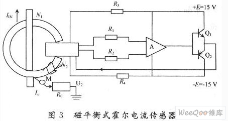電流的測量可采用磁平衡式霍爾電流傳感器(亦稱為零磁通式霍爾傳感器)如圖3所示。