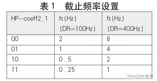 iPhone3.0集成了一個(gè)新的功能,即只需要晃動(dòng)手機(jī)就可以取消剛才的操作。如果通過這樣一些簡單的動(dòng)作來代替按鍵甚至做一些新應(yīng)用,例如搖色子游戲、切換音樂等,就可以使一些常用的功能變得有趣起來。如果采用上述中斷管腳寄存器實(shí)現(xiàn)這樣的功能,就會遇到一個(gè)問題———重力。由于重力的存在,用戶不能簡單地在FF_WU_TSH1寄存器中設(shè)置統(tǒng)一的門檻值來作為晃動(dòng)或者喚醒中斷的判定條件。為此,LIS35DE集成了高通濾波器,能夠?yàn)V除緩慢變化或不變的加速度(如重力加速度),并且可以選擇截止頻率,如表1所示。只有變化頻率高于截止頻率的加速度才能通過。