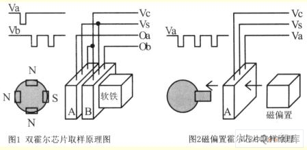 2.1 基本原理 同雙極性開關(guān)型霍爾效應(yīng)傳感器,不同點(diǎn)是A、B兩芯片分別輸出。其中芯片A作為起始”零點(diǎn)”脈沖輸出,芯片B作為旋轉(zhuǎn)角度”順序”脈沖輸出,無論采樣點(diǎn)是多少,只需安裝一支旋轉(zhuǎn)編碼傳感器,一條四芯電纜線,占用兩個(gè)系統(tǒng)接口,結(jié)構(gòu)原理參見附圖1。