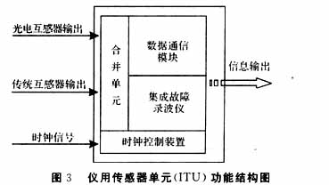 我國變電站自動化系統(tǒng)發(fā)展水平不均衡,既有集中組屏的老式自動化系統(tǒng),又有分散分層先進的自動化系統(tǒng)。光電傳感器的應用必須滿足不同水平的變電站自動化系統(tǒng)。為了與老系統(tǒng)兼容,將IEC定義的合并單元(Merging Unit,MU)擴展到儀用傳感器單元(Instrument Transducer Unit,ITU),使光電傳感器既具備將傳統(tǒng)互感器輸出模擬量數(shù)字化的功能,也具備輸出模擬量的功能[7]。從而具有較高的靈活性,很容易與各種系統(tǒng)接口配合使用。ITU的功能結(jié)構(gòu)圖如圖3所示。