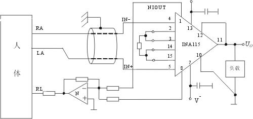 圖1是INA115在心電檢測電路中的實(shí)用電路。放大器的正負(fù)輸入通過心電傳感器分別接到人體的左臂(LA)與右臂(RA)上,與運(yùn)放N和電阻R1~R4組成的驅(qū)動網(wǎng)絡(luò)接到人體的右腿(RL)上,構(gòu)成“浮地”。
