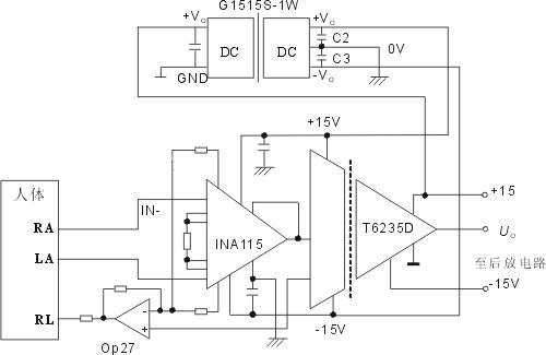 以上電路是由漢為公司的T6235D與INA115等組成的隔離型心電檢測前置放大電路,該電路由于其具有輸入阻抗高、漏電流小、檢測精度高和滿足人體安全等指標(biāo)完全可以達(dá)到醫(yī)療器械使用的要求標(biāo)準(zhǔn)。該電路一般作為前置放大電路,器件直接與人體接觸,并拾取心電信號后通過INA115進(jìn)行放大,最后由ISO122隔離傳輸?shù)胶笾梅糯箅娐,?shí)現(xiàn)人體信號與輸出及電源的隔離放大。