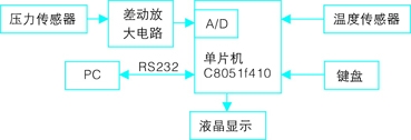 此壓力傳感器采集系統(tǒng)由硬件和軟件兩部分組成,如圖1所示系統(tǒng)硬件主要包括壓力傳感器及其放大部分、溫度傳感器、單片機(jī)電路、顯示部分和鍵盤輸入。軟件部分包括以下模塊:對(duì)單片機(jī)及a/d轉(zhuǎn)換器的初始化、a/d轉(zhuǎn)換器的校準(zhǔn)(包括各通道增益)、零點(diǎn)漂移校正、現(xiàn)場(chǎng)壓力和溫度數(shù)據(jù)的采集、壓力傳感器的零點(diǎn)校準(zhǔn)、溫度漂移補(bǔ)償和非線性補(bǔ)償、串口通訊。單片機(jī)對(duì)接收到的信號(hào)進(jìn)行必要的處理后發(fā)送到顯示設(shè)備顯示給用戶,也可以根據(jù)需要把數(shù)據(jù)存儲(chǔ)到存儲(chǔ)器件中。用戶通過(guò)鍵盤對(duì)系統(tǒng)進(jìn)行控制。